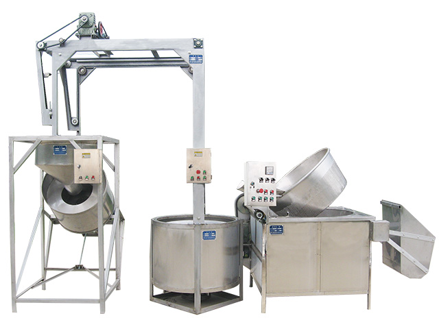 簡易油炸生產線Ⅱ型由油炸機、脫油機、提升機和拌料機組成。其中各部分均可單獨作業的。炸機可以將進入炸鍋的原料從定時炸制,提鍋淋油,提升倒入脫油筒脫油到輸送出去一氣合成。溫度、油炸時間、脫油時間全部由PC機自動控制;炸制效果穩定均勻性好,能有效地控制食品含油量。加工出的產品,香脆可口、味道純正,是生產油炸花生、蠶豆等堅果類食品的設備。